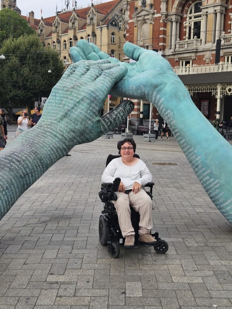 Naast mijn bezigheden voor het platform bezocht ik de tentoonstelling Ik ben gewoon hier in Utrecht. Er was veel te zien, zelfs over gebeurtenissen van vóór mijn geboorte. Zo hingen er foto’s van mensen met een beperking die in 1988 het spoor op Utrecht Centraal blokkeerden uit protest tegen nieuwe stoptreinen, treinen waarin zij niet zonder hulp — of helemaal niet — konden reizen. Met teksten als “Laat de nieuwe trein toegankelijk zijn” maakten zij hun eisen duidelijk. Ook werd zichtbaar hoe mensen met een beperking in de vorige eeuw(en) extreme dingen hebben meegemaakt: vastgebonden worden, weggestopt worden, niet mogen bestaan. Dat maakte indruk. Ik realiseerde me opnieuw hoe blij ik mag zijn dat ik in 1992 ben geboren.